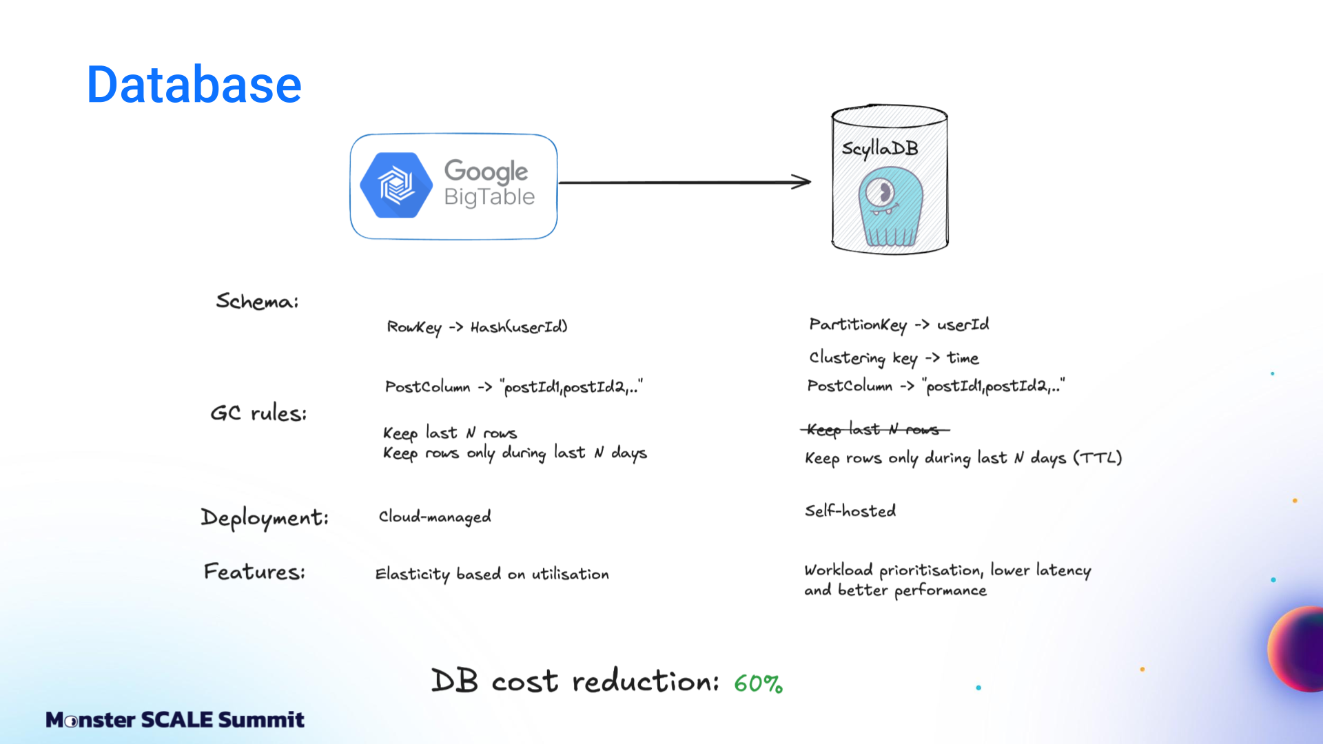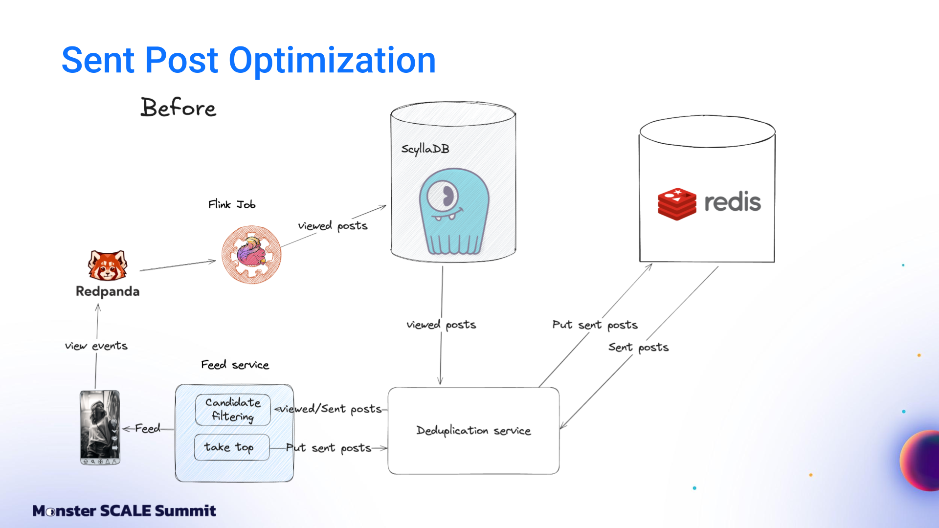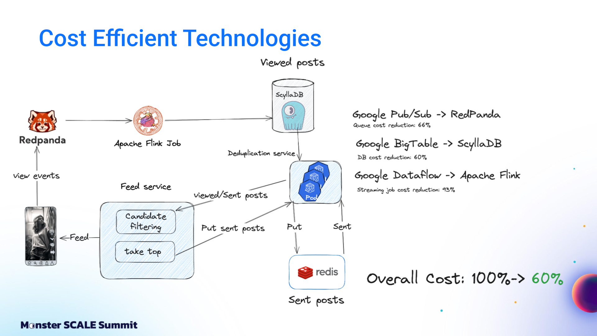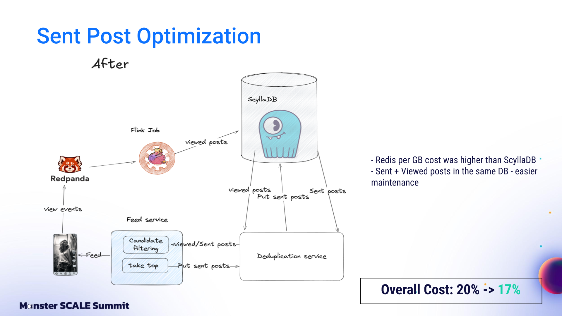 From managed Google Cloud services to ScyllaDB, Redpanda, Flink, and beyond The engineering team at ShareChat, India’s largest social media platform, decided it was time to take a hard look at the mounting costs of running their recommendation system. The content deduplication service at its core was built on Google Cloud’s managed stack: Bigtable, Dataflow, Pub/Sub. That foundation helped ShareChat get up and running rapidly. However, costs spiked as they scaled to 300 million users generating billions of daily interactions. And the 40 ms P99 latency was not ideal for customer-facing apps. If you’ve followed ScyllaDB for a while, you probably know that the ShareChat engineers never shy away from monster scale engineering challenges. For example: Pulling off a zero-downtime migration of massive clusters (65+ TB, over 1M ops.sec) Using Kafka Streams for real-time, windowed aggregation of massive engagement events while keeping ScyllaDB writes minimal and reads sub-millisecond Scaling their ScyllaDB-based feature store 1000X without scaling the database – and then making it 10X cheaper Spoiler: They pulled off yet another masterful optimization with their deduplication service (90% cost reduction while lowering P99 latency from 40 ms to 8 ms). And again, they generously shared their strategies and lessons learned with the community – this time at Monster Scale Summit 2025. Watch Andrei Manakov (Senior Staff Software Engineer at ShareChat) detail the step-by-step optimizations, or read the highlights below. Note: Monster Scale Summit is a free + virtual conference on extreme scale engineering, with a focus on data-intensive applications. Learn from leaders like antirez, creator of Redis; Camille Fournier, author of “The Manager’s Path” and “Platform Engineering”; Martin Kleppmann, author of “Designing Data-Intensive Applications” and more than 50 others, including engineers from Discord, Disney, Pinterest, Rivian, LinkedIn, and Freshworks. ShareChat will be delivering two talks this year. Register and join us March 11-12 for some lively chats. Background ShareChat is India’s largest social media platform, with more than 180 million monthly active users and 2.5 billion interactions per month. Its sister product, Moj, is a short-video app similar to TikTok. Moj has over 160 million monthly active users and 6 billion video plays daily. Both apps rely on a smart feed of personalized recommendations. Effective deduplication within that feed is critical for engagement. If users keep seeing the same items over and over again, they’re less likely to return. The deduplication service filters out content users have already seen before the ranking models ever score it. It’s a standard part of the feed pipeline: fetch candidates from vector databases, filter them, score and rank using ML models, then return the top results. The system tracks two distinct concepts: Sent posts and Viewed posts. Sent posts are delivered to the user’s device. They may or may not have been seen. Viewed posts are items that the user has actually seen. Why both? Viewed posts are tracked on user devices and sent to the backend periodically, passing through queues before being persisted in the database. This creates a delay between the time the event occurs and when it’s stored. That delay makes it possible to send duplicate posts in sequential feed requests. Sent posts solve this by being stored immediately before the response goes to the client. That prevents duplicates from sneaking into subsequent feed refreshes. So why not just use Sent posts? That would create a different problem: “In a feed response, we send multiple posts at once, but there’s no guarantee that the user will actually see all of them,” Andrei explained. “If we rely only on Sent posts, we might deduplicate relevant content that the user never saw…and that can negatively affect feed quality.” The Initial Architecture: Google Cloud, Bigtable, Dataflow, Pub/Sub + Redis The initial architecture was built entirely on Google Cloud. View events flowed into Google Pub/Sub. A Dataflow job aggregated these events per user over time windows and wrote batches into Bigtable. Sent posts lived in Redis as linked-list queues. A deduplication service (written in Go and running on Kubernetes) combined both data sources with feed logic and returned results to the client. It worked. But it was expensive, and latency was a suboptimal 40 milliseconds. Moving to Flink, ScyllaDB, and Redpanda The first optimization step was replacing Google’s managed services with specialized, efficiency-oriented alternatives. Andrei shared, “We replaced Google Pub/Sub with Redpanda, which is Kafka-compatible and more efficient. We replaced Google Bigtable with ScyllaDB, and Google Dataflow with Apache Flink. These changes alone brought costs down to about 60% of the original level.” Dataflow to Flink Dataflow was used for streaming jobs and aggregation events. The team enjoyed having a fully managed service with a simplified API that was nice for prototyping. But at scale, it grew costly. Moving to Apache Flink meant they had to run and maintain their own cluster. Still, it was worth it. They cut the cost of streaming jobs 93%. Bigtable to ScyllaDB On the database front, the team moved from Bigtable to ScyllaDB after comparing their tradeoffs, similarities, and differences. Andrei explained, “First of all, both databases are optimized for heavy write workload. Also, we are able to use a quite similar schema: partition by user ID, store all posts in a single column.” But there were key differences. Bigtable’s autoscaling was valuable given ShareChat’s traffic variability (nighttime traffic drops to less than 10% of peak). At that time, ScyllaDB did not support autoscaling, so ShareChat had to provision clusters for peak load and keep additional buffers for spikes. Bigtable also has advanced garbage collection rules that allow limits on r
