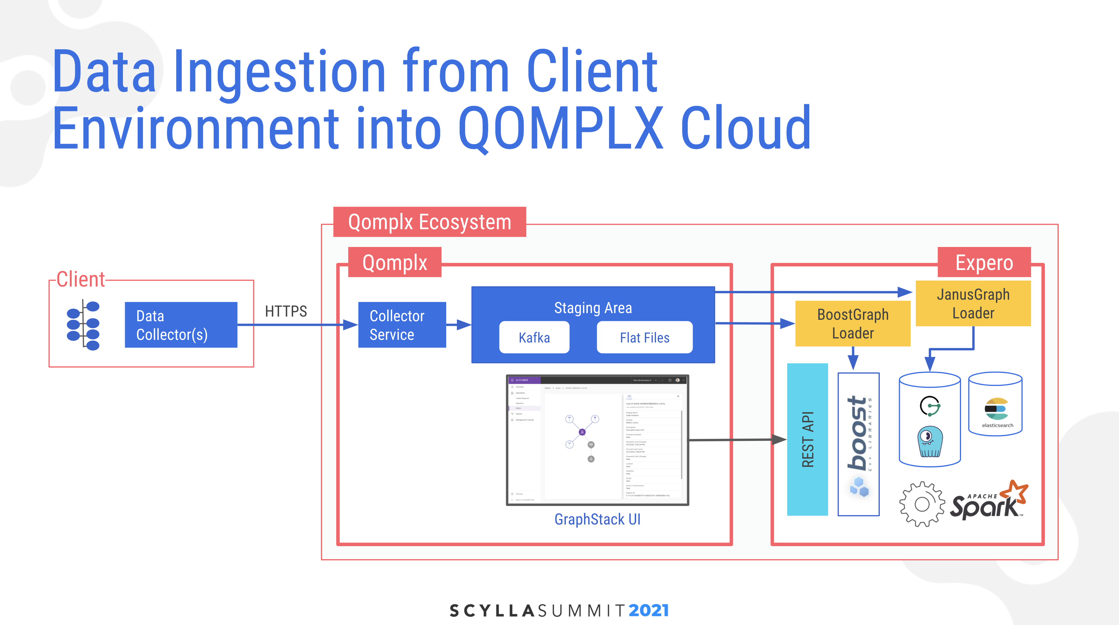 Angad described the architecture for the system beginning with ingestion of data from the client. They have a collector service which uses secure HTTPS on a set of data collectors, which ingests into a single source of truth in a staging area. Here data is also transformed and put into multiple extraction routines, including both Kafka topics for live streaming and flat files for batch processing. “That has been a key learning to us… There is no one magic data store that solves all problems. So based on your needs, insights, and analytics required you might want to place it in different data stores, including in-memory, which in our case is powered by BoostGraph.” His block diagram also noted that beyond JanusGraph and Scylla, there was also Apache Spark and Elasticsearch in his analytics stack.