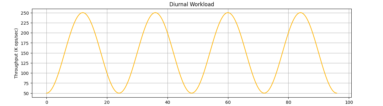 A diurnal workload example, ranging between 50K to 250K operations per second in a day