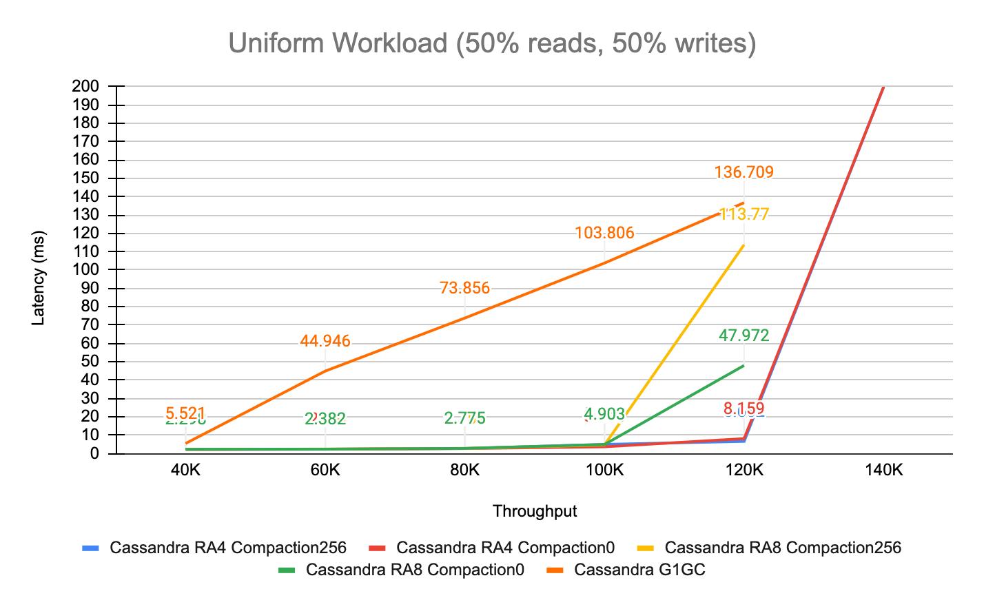 We started by evaluating the performance of G1GC and observed that tail latencies were severely affected beyond a throughput of 40K/s. Simply switching to ZGC gave a nice performance boost, so we decided to stick with it for the remainder of our testing. The following table shows the performance variability of Cassandra 5.0 while using different tuning settings (it’s ordered from best to worst case):