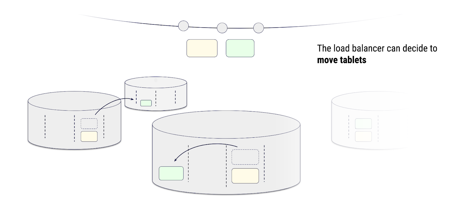 As the topology evolves, tablet state transitions are triggered. A global load balancer balances tablets across the cluster, accounting for heterogeneity in node capacity (e.g., assigning more tablets to replicas with greater resources).
