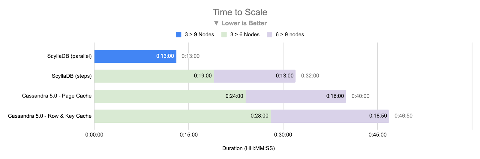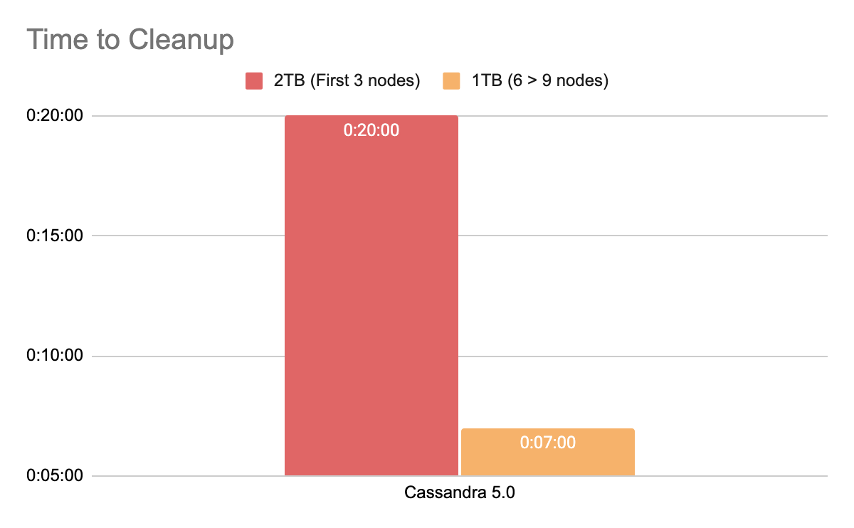 Total scaling time: When including Cassandra’s required cleanup operations (which can be performed during maintenance windows), the time difference reaches 9X