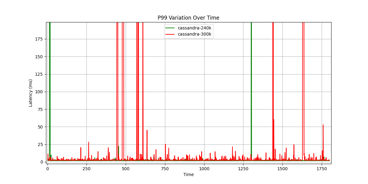 Apache Cassandra latency variability under different throughput rates (240K vs 300K ops/sec)