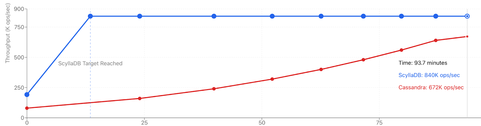 In our tests, ScyllaDB scaled faster and delivered greater improvements in latency and throughput at each step. That reduces the number of scaling operations required. The compounded benefits translate to significantly faster capacity expansion.